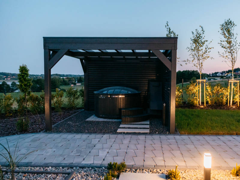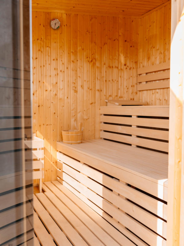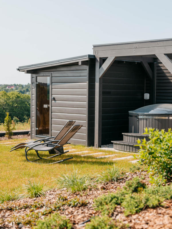 Apartamenty dysponują również tarasem, na którym znajduje się stół z sześcioma krzesłami oraz grill. Każdy apartament posiada prywatne jacuzzi oraz saunę z widokiem na jezioro, a także leżaki i plac zabaw dla dzieci. Goście mogą korzystać z bezpłatnego dostępu do sieci Wi-Fi.