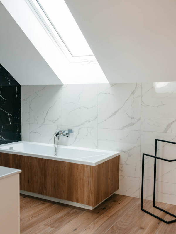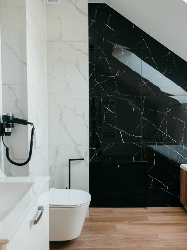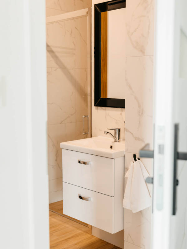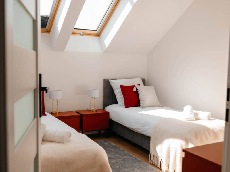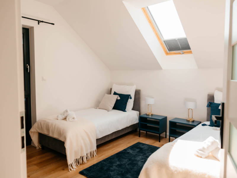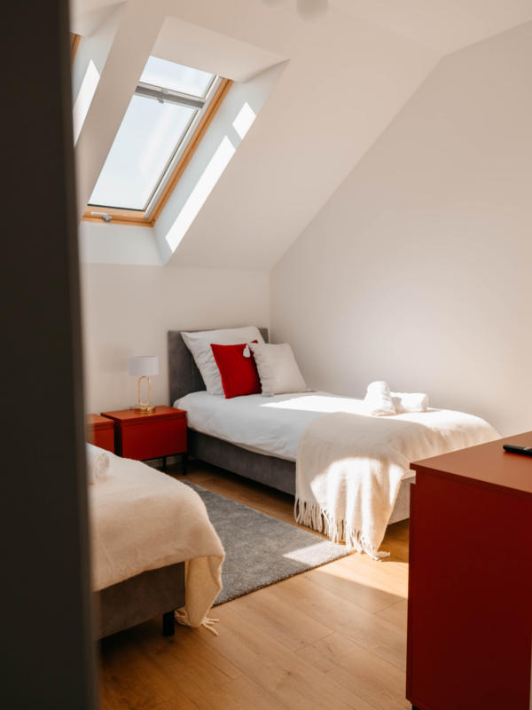 Na parterze znajduje się łazienka z prysznicem, a dodatkowo goście mają do dyspozycji suszarkę wolnostojącą, deskę do prasowania oraz żelazko. Na piętrze mieszczą się trzy sypialnie – jedna wyposażona jest w łóżko małżeńskie, natomiast pozostałe dwie oferują po dwa łóżka pojedyncze. Każda z sypialni posiada własny telewizor. Dopełnieniem strefy prywatnej jest przestronna łazienka z wanną.